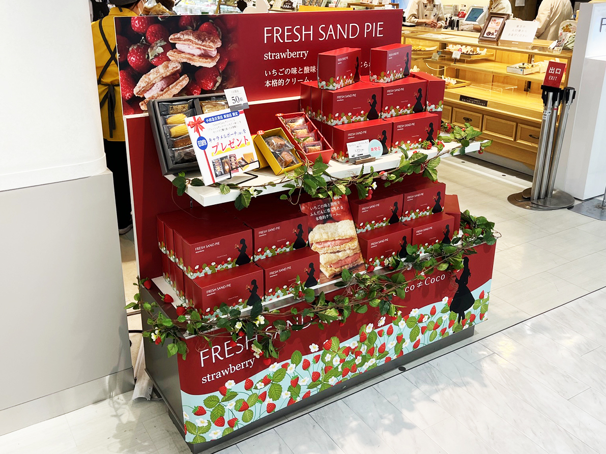 イチオシ商品は「フレッシュサンドパイ いちご」とのことなので、 この商品を1番人の流れがある場所に配置。いちご感満載の装飾を施しました。 装飾の割には比較的低価格に抑えることができました。